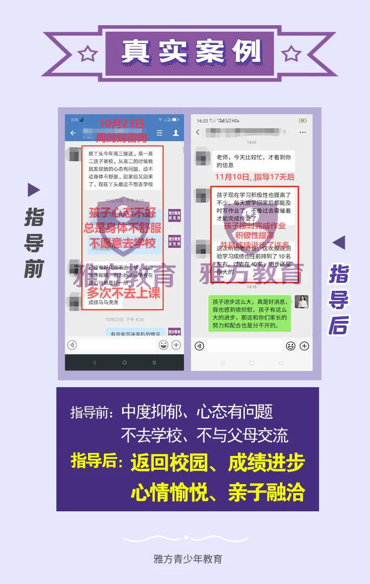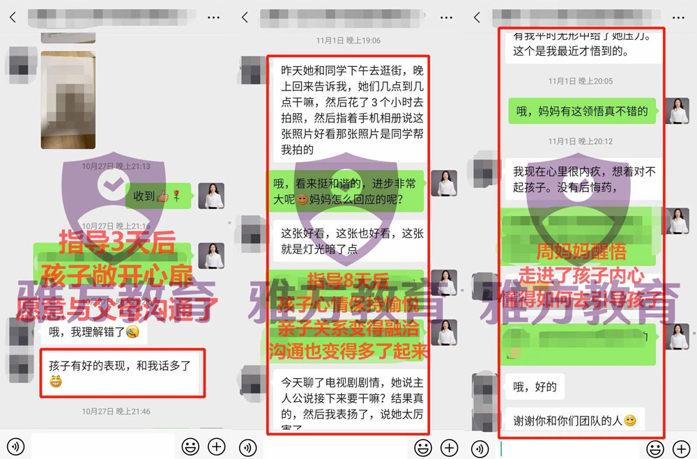 这个世界上没有后悔药,是我之前一直耽误了孩子,现 在通过雅方家庭教育的指导后,终于走进了孩子的内心,懂得了如果正确去引导孩子、帮助孩子!