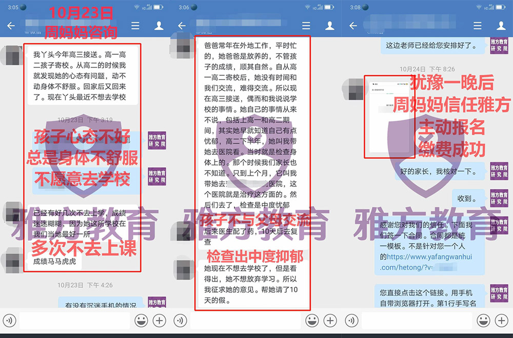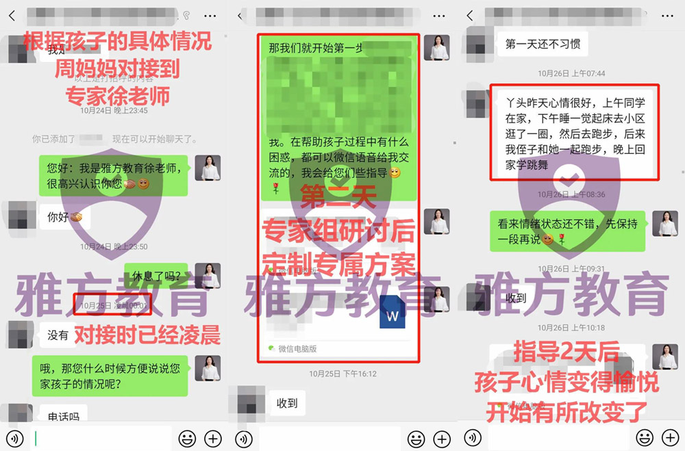 2020年10月23日,周妈妈通过朋友介绍,了解到了雅方家庭教育,与分析师沟通孩子的情况。
